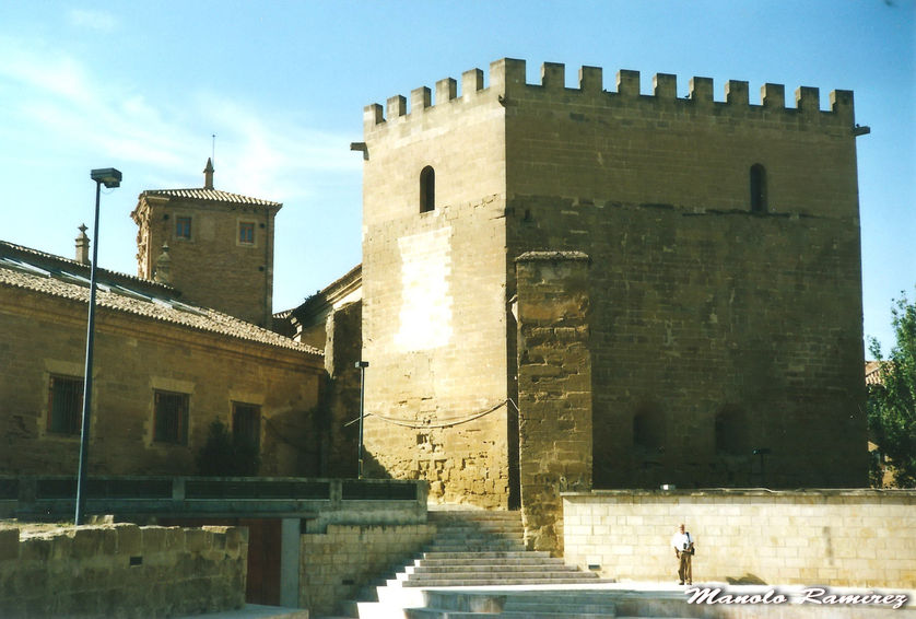 El edificio original fue edificado sobre una torre islámica en el siglo XII, para albergar a los reyes de Aragón. Una torre de planta rectangular y coronada con almenas es el único resto que queda del palacio. En las plantas inferiores de la torre se encuentran la famosa Sala de la Campana y la de Doña Petronila.